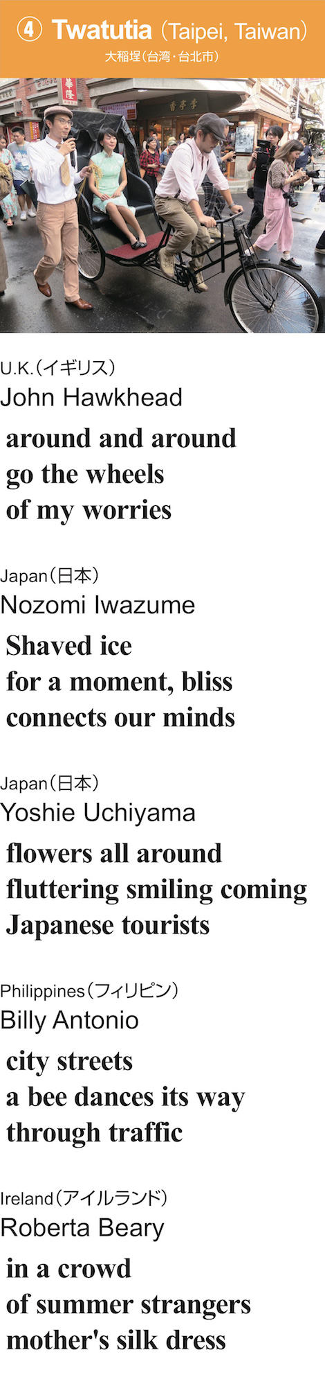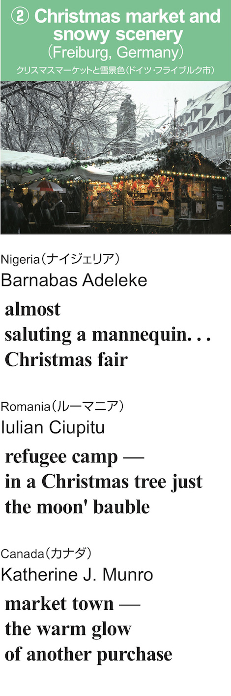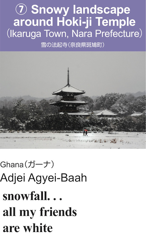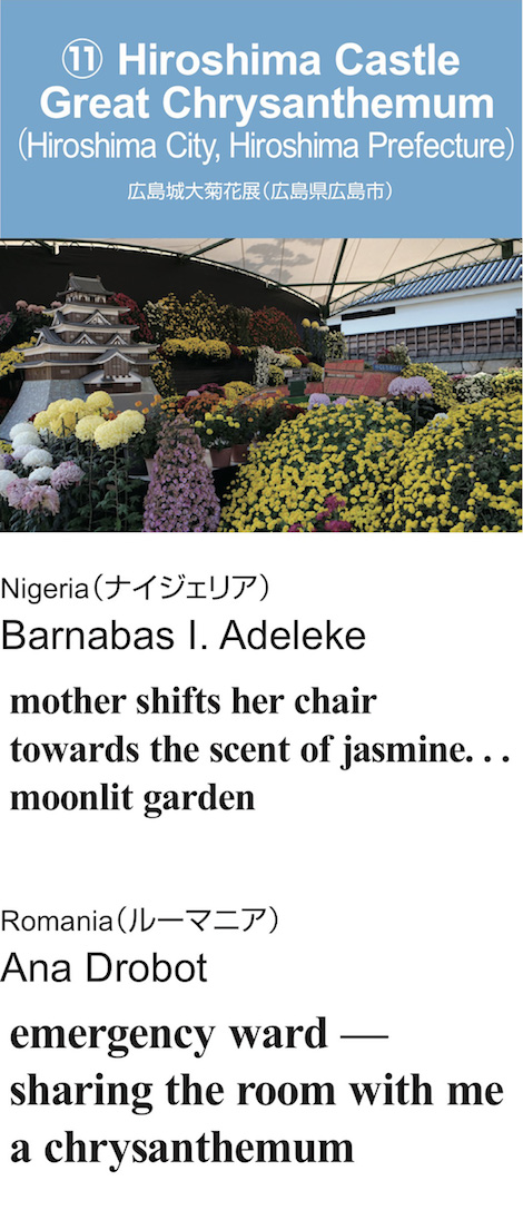 Congratulations go to all the haikuists from 42 countries around the world who entered 3,571 works to the 7th Setouchi Matsuyama International Photo-Haiku Contest. From the 1,484 entries of photo-haiku in English, 60 winning haiku were selected for honorable mention. From this list, 8 works were awarded certificates and prizes of goods equivalent to 58,000 yen.