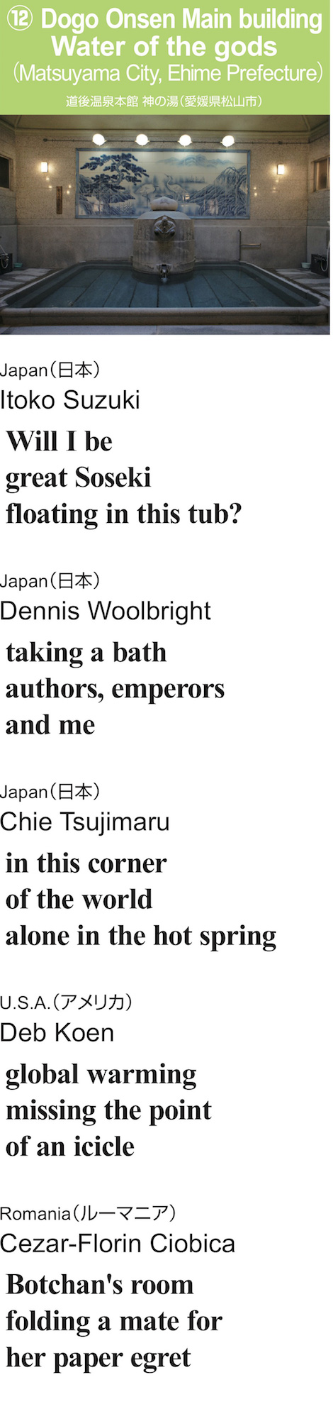The famed Dogo hot spring is no match for an aging mother’s dear memory of bathing her baby in a plastic tub. A councilor for the Haiku International Association, and a leading member of Ten’i (Providence) haiku group led by Dr. Akito Arima, Emiko Miyashita believes that authenticity is most important when she writes in English. Haiku has to be brief and it has to be from the real experience.